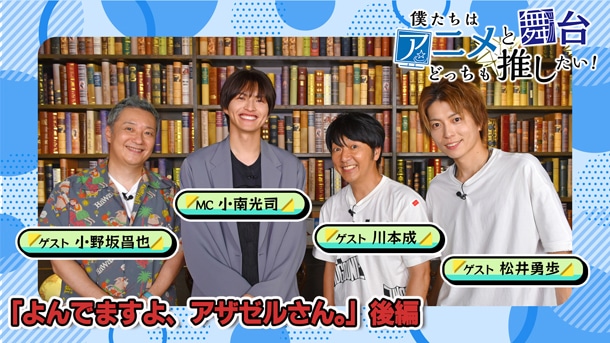 「よんでますよ、アザゼルさん。」後編。アニメ、舞台ともに主役のアザゼル役を演じた小野坂昌也、舞台の脚本・演出を務めた川本成、舞台で芥辺役を演じた松井勇歩の3人をゲストに招き、アニメと舞台それぞれの目線から作品の魅力を語ります。