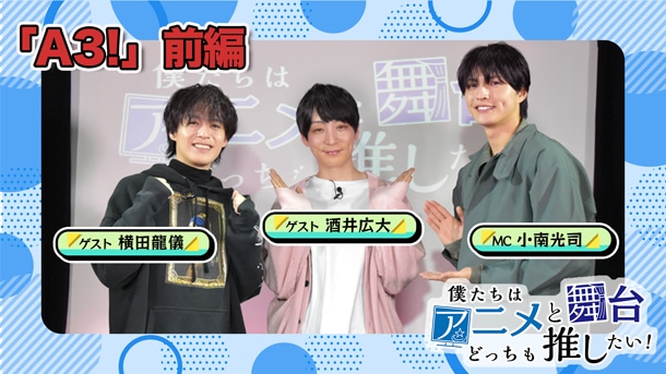 「A3!」前編。原作ゲーム・アニメ『A3!』で佐久間咲也役を演じている酒井広大、MANKAI STAGE『A3!』で佐久間咲也役を演じている横田龍儀の2人をゲストに招き、それぞれの目線から作品の魅力を語ります。